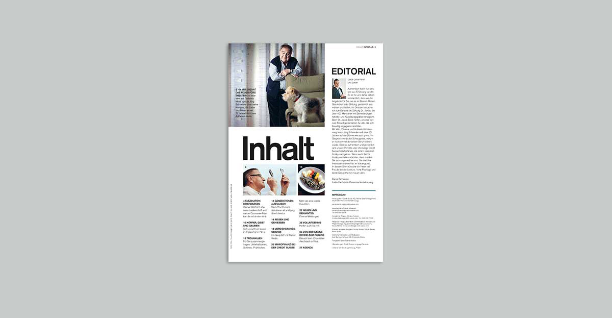 Redesign und Layout für das Pensionierten Magazin der Credit Suisse im Auftrag von Axel Springer Corporate Media. Creative Director: Sebastian Adrian; Art Director: Rudi-Renoir Appoldt